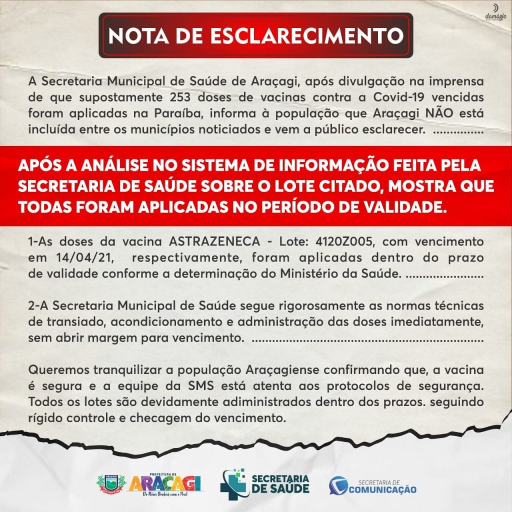 A Prefeitura Municipal de Araçagi, através da Secretaria de Saúde, vem a público esclarecer que: após uma minuciosa análise, ficou constatado que NENHUMA dose de vacina contra a COVID-19 foi aplicada fora do prazo de validade em nosso município. Todas as documentações necessárias que comprovam essa afirmação estão disponíveis na Secretaria de Saúde. Dessa forma queremos tranquilizar toda população araçagiense, garantindo total eficiência no processo de vacinação dos araçagienses.